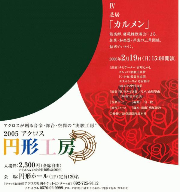 芝居「カルメン」 能楽師、鷹尾維教氏の演出による芝居・和楽器・洋楽のコラボレーションで「カルメン」を上演します。 awaiでは、キモノでこの「カルメン」を見に行きたいと思います。ご希望の方は書き込みまたは、awaiまでお電話等でお申込ください。 入場料:2,300円(全席自由) 会場: アクロス福岡 円形ホール(1F) 福岡市中央区天神1丁目1番1号 定員: 20名限定 ※awai用として20席を用意して頂きました。 20名になり次第締め切らせていただきます。 http://www.acros.or.jp/conc