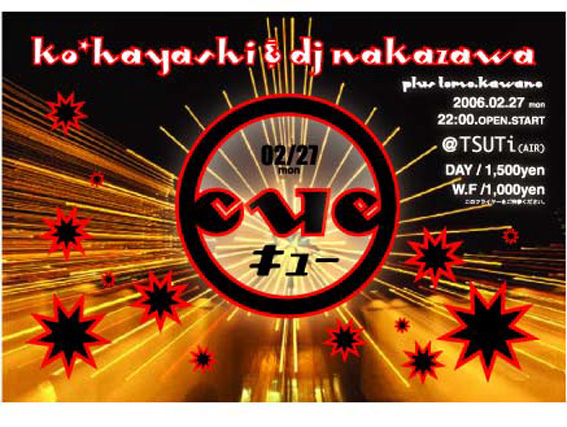 Dj Nakazawa & Ko*Hayashi のスーパーコンビが送る、 『 CUE !! 』第2弾です! 最近、 MIX CD をリリースした二人・・・ その感性は確実に進化し、より研ぎ澄まされています! このコンビが見れるのは本当に希少なコトです・・・ 福岡の CLUB SCENE はこの二人ナシには語れない! ハッキリ言って来ないと損です!(^0^;) Day \1,500- With Flyer \1,000-
