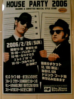博多ケントスハウスパーティーを開催します。 パーティーでは、写真にもあるブルースブラザーズのミュージカルもしますので、お楽しみに。 スタッフも何名か借り出されてます(笑) 日時 ・2月26日(日) ・16:00〜19:00 前売りチケット \2100 税込 当日チケット \2620 税込 小学生以下のお子様は無料。 ドリンク・フード持込可。 お子様入場可。 お問い合わせ、チケット購入は博多ケントスまで。 http://www.cosmoact.com/kentos/top.html