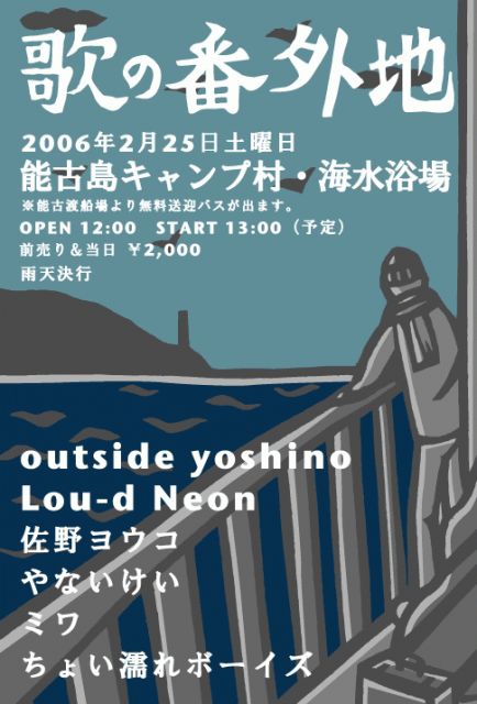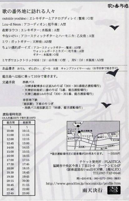 「天沼メガネ節」より ━━━━━━━━━━━━━━━━━━━━━━━━━━ で!調子ん乗って、そん次は福岡に行くぞ俺!大丈夫なのか俺! しかも島!博多から船で10分くらいで着く「能古島」って島でやります。 檀一雄の最後の地としてもお馴染みの島っす。ワクワクっす。 『歌の番外地/福岡 能古島』フライヤーはこちら (http://www.saka-sho.co.jp/parsonal/yoshino/noco-front-b5.gif)。 2006/2/25(土)福岡能古島キャンプ村・海水浴場 open 12:00 start 13:00 2,000yen(能古渡船場より無料送迎バス有り) outside