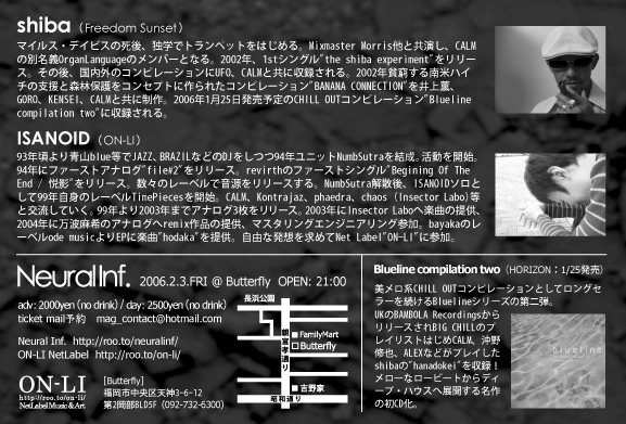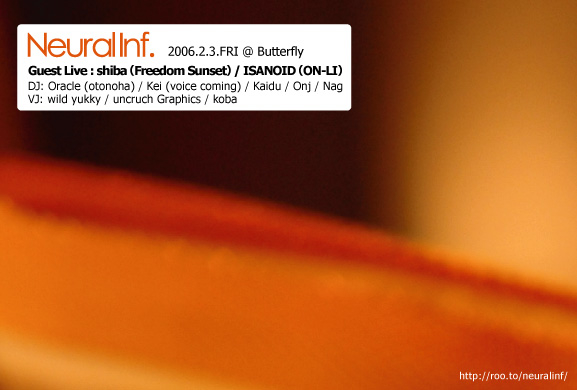 Neural Inf. 2006.02.03 (Fri) @ Butterfly Guest Live: SHIBA (Freedom Sunset) / ISANOID (ON-LI) DJ: Oracle (otonoha) / Kaidu / Kei (Voicecoming) / Onj / Nag VJ: Wild Yukky / uncruch Graphics / Koba open:21:00 / day: 2000yen(no drink) / day:2500yen(no drink) mail予約: mag_contact@hotmail.com web: http://roo.to/neuralinf/ **************************** SHIBA,ISANOIDの音源をフリーで「ON-LI netlabel」から聴く事ができます。 SHIBA: ON-LI→SOUND→[ON-LI_007] ISANOI