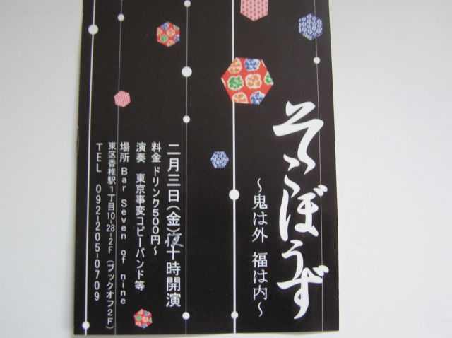 九工大のやなくて 高校の部活の時の知り合いにさそわれて 助っ人としてドラムします。 東京事変のコピーします。 あと女の子に誘われてやってますんで 俺以外メンバー女の子多めw その友達来るから 客も女の子多いと思うw 詳細は start 22:00 入るには 500円 one drink付 払ってもらえばはいれます。 演奏聴くも良し 女の子見るも良し 酒だけ飲んで帰るも良し って感じです。 自分の出番はたぶん10:00ちょいすぎ って言われたんで それくらいに来てもいいです。 画像クリックしたらおおきくなるかも 質問あれ