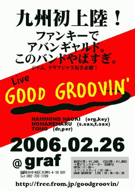 **GOOD GROOVIN'初の天神ライブ決定!************ 2003年より東京を中心に活動を行っているGOOD GROOVIN’が活動拠点を福岡に移してのライブ第一弾。ファンキーで、アバンギャルド。聴衆と一体になってぐいぐいとグルーヴの渦に巻き込みます。ジャムバンド、クラブジャズ、ジャズ、ソウル、ファンク好きは必聴!mixiの新たな仲間で盛り上がりたいと思いますのでお気軽に遊びに来てくださいヾ( ̄◇ ̄)ノ 2月26日(日)福岡・天神 【graf-グラフ】 (住所:福岡市中央区天神3-4-19 B1F Tel:092-733-1199 http://www.graf-graf.com/)