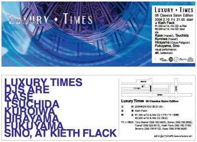 2月10日(金) Luxury Times 〜Classics Edition〜 @Keith Flack 21:00 start Djs/Kase,Tsuchida,Kuroiwa,Hirayama,Fukuyama,Sino Vj/ak. adv \1500 door \1800 doth w/1 drink&mix CD(ltd) 今回は諸事情で第二金曜日になりましたー。もうすぐフライヤーができるんで日曜までには天神のお店に並ぶと思いますんで宜しくお願いします!