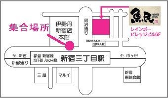 ※集合に遅れる方は予め幹事までご連絡下さい。 日時:2/11(土) 19:00〜 集合:新宿・伊勢丹前 18:40集合 ※目印として、幹事は腕章を着けております。 ※18:50には移動開始します。 場所:魚民 新宿伊勢丹前店 http://www.roza.monteroza.co.jp/view/View_shop.php?SP_CD=802346 電話:03-3356-6488 費用:4500円 ※3時間飲み放題付きコースです。 ※二次会の予定はありません。 ※お釣りは用意しておりませんのでご注意下さい。 -----------------------------------------------------