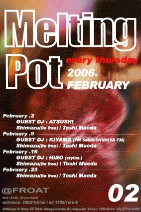 - Melting Pot Specail 14- MUSIC: TOSHI MAEDA & KEISUKE SHIMAZU (Befree) GUEST DJ :DJ HIRO (stylus) DATE: 2006. 02.16 (THU) OPEN: 21:00 〜 24:00(HAPPY HOUR) START:24:00 〜 ADMISSION FEE : \2.000 with 1 drink (W/F \1.500 with 1 Drink) <"Happy Hour" 21:00〜24:00 / Entrance Free /Drink All ¥500> venue : SHIBUYA "FROAT" Shibuya R Bldg 5F 32-8 Udagawacho Shibuya-ku Tokyo TEL : 03-3770-0080 http://www.shibuya-froat.com ht