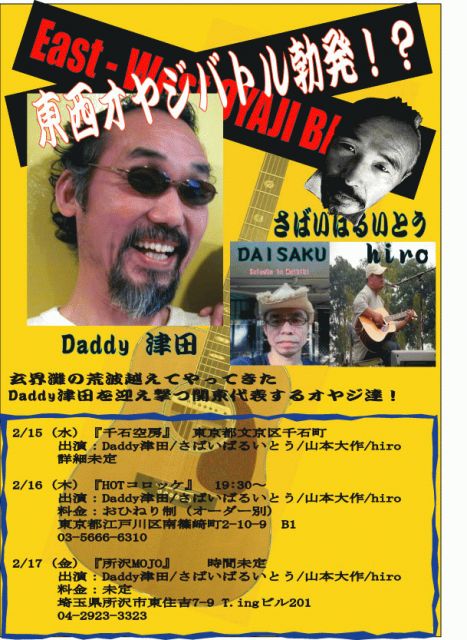 BayFM,NACK5の企画OLEっちでもお馴染みの「さばいばるいとう」が九州からDadyy津田と言うオヤジを向かえて 企画ライブを行います。 場所:瑞江HOTコロッケ 時間:19:00OPEN 入場無料で投げ銭スタイル!(飲食別途)