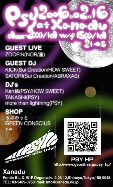 2006.2.16(thu) PROGRESSIVE CROSSOVER MUSIC PARTY 《PSY》 @Xanadu(Shibuya) 03-5489-3750 www.xanadu.ne.jp 21:00 start 05:00 fin fee 2000yen/1d wf 1500yen/1d GUEST LIVE ZOOFIN(NOR/蓮) GUEST DJ's KICK(Sui Creation/HOW SWEET) SATORI(Sui Creation/ABRAXAS) Toki(SAMURAI SPIRIT/NUMBER3) DJ's Ken爺(PSY/HOW SWEET) Takashi(PSY) more than lightning(PSY) LIVE PAINTING まりこ ART 美琴 SHOP らぶのっと GREEN CONSCIUS) +α ☆ジャンべのライブセッションとベリーダンスショーもあります!