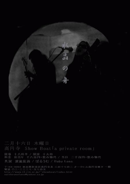 二月十六日 木曜日 高円寺 Show Boat 「 a private room 」 水晶の舟 波流乱満 ばるうむ Baby Lons 開場 十八時半 開演 十九時 料金 前売り 千八百円 + 飲み物代 当日 二千百円 + 飲み物代 〒166-0002 東京都杉並区高円寺北 三の十七の二 オークヒル高円寺地下 一階 電話 〇三・三三三七・五七四五 http://www.t3.rim.or.jp/~showboat/index.html suishounofune@yahoo.co.jp