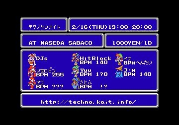 DATE / 2006-02-16(Thu) 19:00-23:00 PLACE / Sabaco(早稲田) FEE / 1,000yen/1D(with flyer) / 1,000yen/1D(without flyer) DJ: HitBlock, イナ, Yuu, アフ, J.M, さとふ Live: いせロビン, Yuu? TimeTable 19:00 - J.M - 19:20 - さとふ - 19:40 - アフ - 20:00 - イナ - 20:45 20:45 - いせロビン(Live) - 21:15 - Hit Block - 22:00 - Yuu(Live?) - 23:00 テクノサークル、テクノケンが遂にイベント開催!! 流血DJことHitBlockを始め、変態ブレコアのイナ、ゲームボーイを使ったライブで注目のいせロビンなど、見どころが一杯!