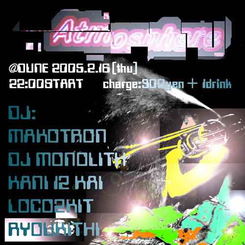 Atmosphere@三軒茶屋DUNE http://www.djbar-dune.com/ 2005.2.16(thu) 22:00START!!!!!!! charge:300yen+1drink >>>SCIENTIST AT DUB<<< DJ:DJ MONOLITH/冠位十二階/露骨キット /MAKOTRON(ひよこレコード)/RYOUKITHI