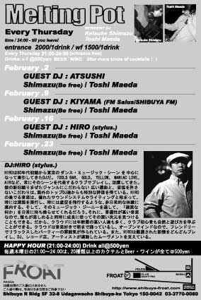 - Melting Pot Specail 14- MUSIC: TOSHI MAEDA & KEISUKE SHIMAZU (Befree) GUEST DJ :DJ HIRO (stylus) DATE: 2006. 02.16 (THU) OPEN: 21:00 〜 24:00(HAPPY HOUR) START:24:00 〜 ADMISSION FEE : \2.000 with 1 drink (W/F \1.500 with 1 Drink) <"Happy Hour" 21:00〜24:00 / Entrance Free /Drink All ¥500> venue : SHIBUYA "FROAT" Shibuya R Bldg 5F 32-8 Udagawacho Shibuya-ku Tokyo TEL : 03-3770-0080 http://www.shibuya-froat.com ht