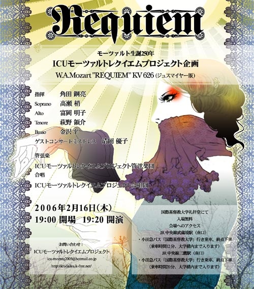 いよいよ明日です。=無料= 是非聞きにいらしてください! 開催予定場所: 国際基督教大学内教会 予定演目: Mozart Requiem d-moll KV 626 ジュスマイヤー版 出演者紹介 指揮者:角田鋼亮 (東京藝術大学指揮科卒) 合唱指導:萩野領介 (国立音楽大学声楽科卒) ソリスト: ソプラノ 高瀬 梢 アルト 富岡明子 テノール/合唱指導 萩野領介 バス 金沢 平 http://icudaiku.k-free.net/