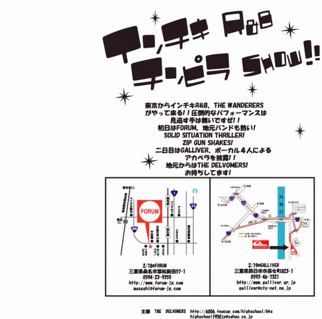 インチキR&B、THE WANDERERSがやって来る!!! 【インチキR&BチンピラSHOW!!】 2006.2/18sat @FORUM http://www.forum-jp.com 三重県桑名市繁松新田57-1 0594-23-9355 18:00open 19:00start advance \3500 1drink door \4000 1drink THE WANDERERS(tokyo) SOLID SITUATION THRILLER ZIP GUN SHAKES DJ MAKOTO 2/19sun @GALLIVER http://www.galliver.gr.jp 三重県四日市市采女町823-1 0593-46-7321 19:00start \15001drink ヨンダラーズ(from WANDERERS) THE DELVOMERS
