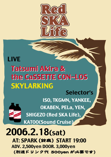 いよいよ今週の土曜日です。 『Red SKA Life』 日時:2006.2.18(sat) 時間:19:00 START - MID NIGHT 会場:三重県鈴鹿市 SPARK (0593-78-8686) 料金:前売 2,500円 当日 3,000円 (別途Drink代500円が必要です) ■Live Tatsumi Akira & the CaSSETTE CON-LOS http://www.basisrecords.com/tatsumi/index.html http://www.con-los.com/ SKYLARKING http://www.geocities.jp/jamaica_skylarking/ http://mixi.jp/view_community.pl?id=539924 ■Selector's ISO / TKGMN / YANKEE / OKABEN / PELa YEN / SHIGEZ