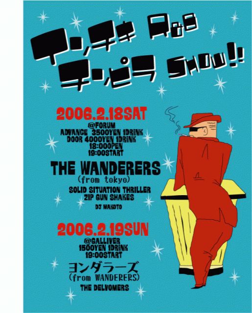 インチキR&B、THE WANDERERSがやって来る!!! 【インチキR&BチンピラSHOW!!】 2006.2/18sat @FORUM http://www.forum-jp.com 三重県桑名市繁松新田57-1 0594-23-9355 18:00open 19:00start advance \3500 1drink door \4000 1drink THE WANDERERS(tokyo) SOLID SITUATION THRILLER ZIP GUN SHAKES DJ MAKOTO 2/19sun @GALLIVER http://www.galliver.gr.jp 三重県四日市市采女町823-1 0593-46-7321 19:00start \15001drink ヨンダラーズ(from WANDERERS) THE DELVOMERS ■THE WANDERERS(tokyo)