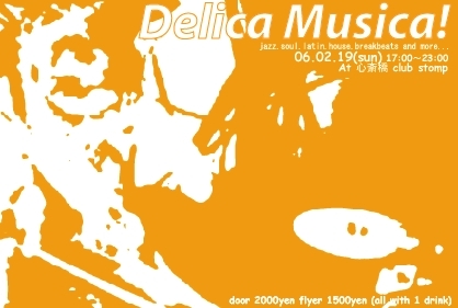 =Delica Musica!= 今回のデリカ・ムジカ!はホストバンド『OLD ARAQ』と相性の良いバンドをブッキング。−ジャズ、ソウルなど生音から、ハウス、ブレイクビーツ、エレクトロまで−と様々な音楽を“ポップ”かつ“スタイリッシュ”につなぐ、毎回良質なライブとDJが楽しめるナイスなイベントです!お酒の似合うちょっぴり大人なサウンドだったり!ハネたリズムに洒落たコード感!そしてファンキーなベースライン!!日曜の夕方から終電までなので大人が気軽に楽しめるイベントです。お腹が空いても大丈夫!チカフェが用意するおいしいごはんをいた