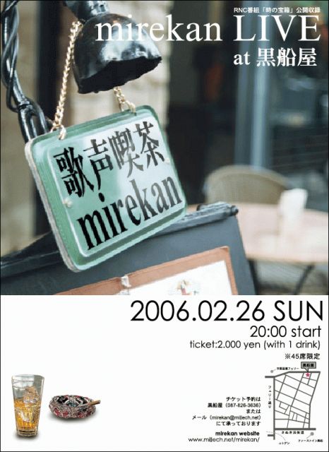 チケット:2,000円(1ドリンク付) 今回のテーマ「歌声喫茶」の名の通り、皆様ご存知のなつかしナンバーやっちゃいます。 ぜひぜひ一緒に唄いに来て下さいませ。 45席限定ですので、ご予約をお願いいたします。 私までメッセージいただきますか、 黒船屋(087-826-3636)までお電話よろしくお願いいたします。 ※ライブの際、RNC番組「時の宝箱」の公開収録もいたします。