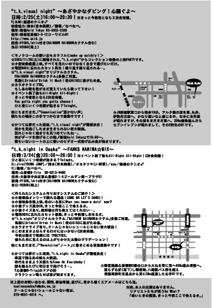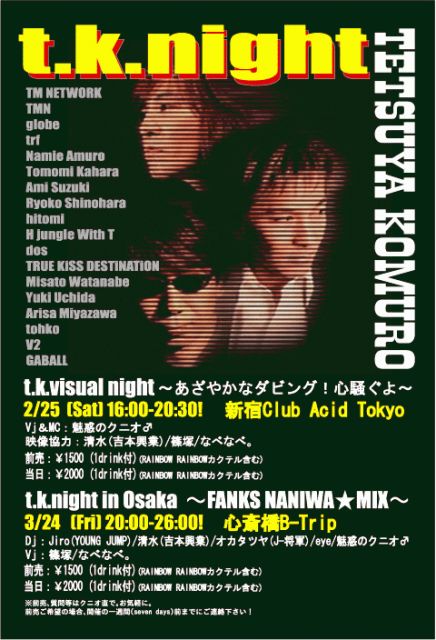 皆さんお疲れ様です。 待望の詳細発表です。 こちらも楽しい開催に出来るよう努力致しますね。 皆さんご意見是非ともよろしくです。 ご協力頂ける方も引き続き募集致しておりますので、 遠慮なくご一報下さいね! “t.k.night in Osaka” 〜FANKS NANIWA☆MIX〜 日時:3/24(金)20:00〜26:00! ※イベント終了後もAll-Right All-Night!2次会完備! ひと夜にいくつ奇蹟が起きる?Toinght。 Dj:Jiro(YOUNG JUMP)/清水(吉本興業)/ オカタツヤ(J-将軍)/eye/魅惑のクニオ♂etc. Vj:篠塚/なべなべ。 場所:心斎橋B-Trip