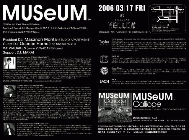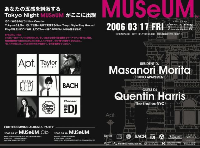 こんにちは! STUDIO APARTMENT 森田です。 早いもので2006年も3月を迎えようとしていますが、皆様如お過ごしでしょうか?ワタクシ森田は、新年早々からバタバタと仕事に追われながらも、充実した毎日を送っています。そんな中この度新しくメインパーティーをスタートさせる事になりました。 皆様是非遊びにいらして下さい。 どこから話していいのやらという感じではありますが、軽くここまでの流れを・・・。まず2006年に入りSTUDIO APARTMENTが主宰するレーベル「Apt.」を設立しました。その第一弾リリースとしてMIX CDシリーズ『MUSeUM』の