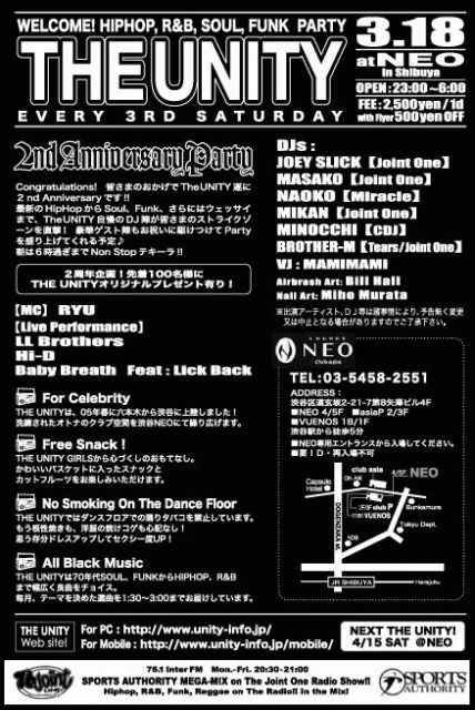 ☆2006年3月の"THE UNITY" は 3/18(Sat)に開催しま〜す! (毎月第3土曜日開催中!) ☆3月のテーマは"2nd Anniversary"です。皆さまのおかげで遂にThe UNITYも2年を迎える事が出来ました!本当に感謝です!3月はThe UNITY DJs総出演、LIVEも3組、RYUのMCも登場で、お祭り騒ぎです!なんと朝6時まで開催します!オシャレして来てネ!俺もスーツで登場予定デス♪ ☆先着100名様に、The UNITY特製プレゼントあり! ■PLACE : 渋谷NEO(Vuenosの5F&6F) 23:00〜Past 6:00 ■FEE : 2,500Yen ( With Flyer 500yen off / 1d )