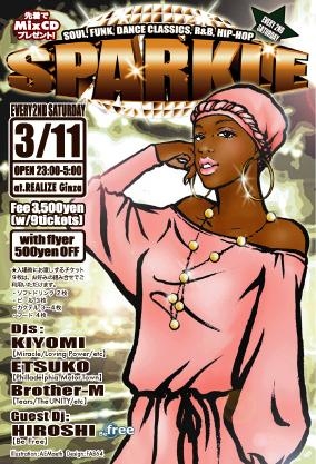 ☆SPARKLE☆ Vol.XII* "SPARKLE"(毎月第2土曜日23:00〜開催!) @REALIZE Ginza 毎月弟2土曜日23:00〜華の銀座でお送りしているNEWイベントです!ダンクラ、Funk、Soulから最新R&B・Hip-Hopまで、Black Music全般を楽しんで頂けるイベントです! 今回12回目はレギュラーのKIYOMI、ETSUKO、BROTHER-Mの3人+ゲストDJにBe FreeよりDJ HIROSHIを迎えてお届けし致します!お得意のミドルHiphopが爆発か!?☆3月も皆さまと一緒に楽しい夜を過したいと思っております!SPARKLE・・・煌き、閃光・・