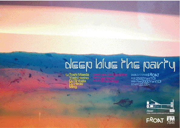 さて、さて2006年初のDeep Blueのパーティーです☆ ふるってあそびに来てください〜 今回は、フードも加わります!めちゃウマです!! DJ : Toshi Maeda Yoshi Horino DJ Shibata DJ Hiroki Ming DRINK GIRL : Sunshine DECO : Jambow! FOOD: SHOESTRINGS http://shoestring.exblog.jp/ Open 22:00 Fee 2500yen(1D) w.f. 2000yen(1D)