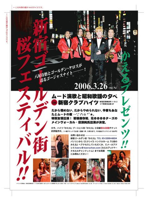来る3月26日(日)に、新宿ゴールデン街の40店舗を越えるお店が集まった雨天決行の花見宴会 「桜祭り(sakura-festival)」が行われます。 場所はなんと、娯楽の殿堂『クラブハイツ』! 午後2時から10 時まで 続くパフォーマンス満載のイベントで、そこで当ムード歌謡コミュではカラオケスナック「かえる」の出し物として、クラブハイツのステージでムード歌謡を歌います〜!!! 皆さんもドレスアップした衣装でステージにバックコー ラス又はダンスなど致しませんか? 一般飲むだけの参加も大歓迎! 【日 時】 2006年 3月 26