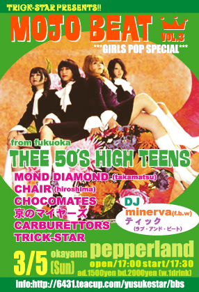 お待たせしました。mojo beat vol.3開催です。 今回のmojo beatのテーマは「60sひな祭り」。話題のガールズバンドたくさん出ますよ〜。 ステキな一夜をお約束します。 3/5(日)MOJO BEAT vol.3 岡山pepperland ad\1500 bd\2000 出演 *THEE 50's HIGH TEENS(福岡) *mond diamond (高松) *chair(広島) *京のマイヤーズ(岡山) *chocomates(岡山) *carburettors(岡山) *trick-star(岡山) DJ ミネルバ(F.B.W) ティック(ラブ・アンド・ビート) チケット予約熱烈受付中!!