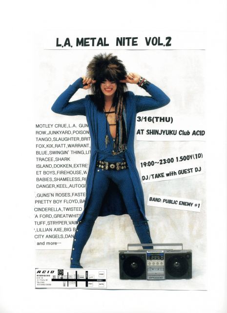 皆様、初めまして☆ TAKE ROCKと申します。LAメタルオンリーのクラブロックイベントを先月より開催しました。本当に好きな人が集まるのでイイ感じで盛り上がります。ぜひ遊びにいらして下さい! ■L.A.METAL NITE VOL.2■ 3/16(木) 19:00〜23:00 新宿CLUB ACID新宿2-3-12 コーワビルB1(03-3352-3338) 1,500Y with 1DRINK BAND:PUBLIC ENEMY #1(21:00〜) 前回好評だったLAメタルナイト今月も開催します! フロアに大音量で流れるLAメタルの名曲で踊って飲んで盛り上がりましょう!もちろん懐かしい映像もON AIRします。仕事