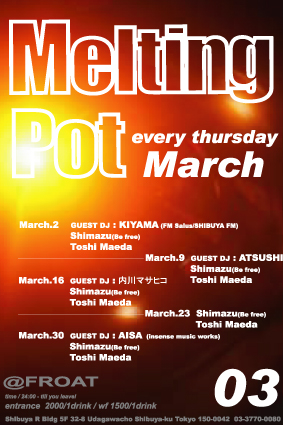 3月16日(木)”MELTING POT SPESIAL15”@FROATは 昨年11月にもSPECIALで登場した"DJ 内川マサヒコ"さんが ”MELTING POT”に再登場してくれま〜〜す!!! 今年2月、3月と "Rhythm Of Elements"名義で素晴しい新曲を発表して 勢いに乗っている内川さん!! 今回もノリの良いHOUSE&CLASSICSや DEEPなDUBでフロアーを熱くしてくれると思います。 それから いつも”MELTING POT”に遊びに来てくれる 僕のマイミク☆モトク〜〜ン☆のバースデーを やっちゃおうと思いま〜〜す。笑 踊りたい人 誕生日近い人 乾杯した