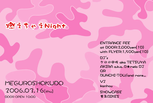 ENTRANCE FEE at DOOR:2,000yen(1D) with FLYER:1,500yen(1D) DJ's ケロロ中佐 aka TETSUYA AKIRA a.k.a. B★melo DJ QR BUNCHI-TOU/and more... VJ kanhou SHOWCASE 男気BIKES