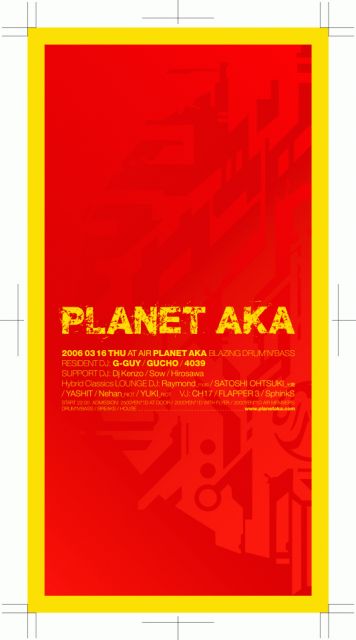 2006. 03. 16(THU)@AIR 代官山 PLANET AKA -BLAZING DRUM & BASS- START 22:00- Door:2500yen(1D)/with flyer:2000yen resident DJ:G-GUY/GUCHO/4039 Support DJ:Kenzo/Sow/Hirosawa Vj:CH17/Flapper3/SphinkS <<Hybrid Classics>>Lounge: Raymond(mold)/SATOSHI OHTSUKI(光響)/YASHIT/Nehan(Riot)/Yuki(Riot) info http://www.air-tokyo.com
