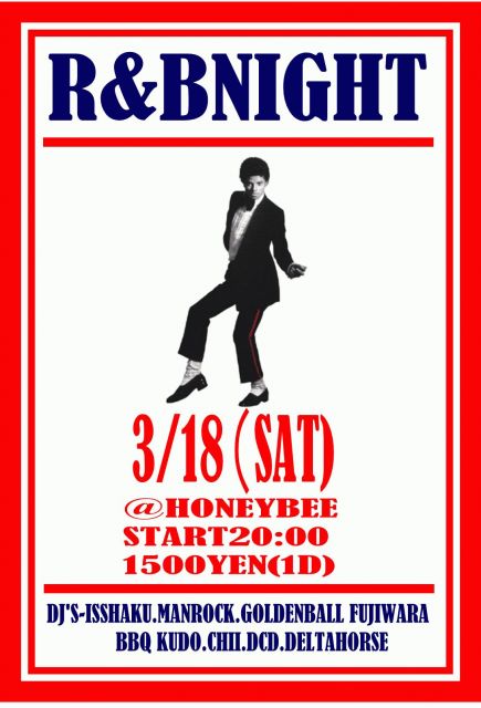 「 R&B ナイト 」 3/18(土)@ハニービー(山王) PM8:00〜 DJ'S ISSHAKU MANROCK GOLDEN BALL FUJIWARA BBQ KUDO CHII DCD DELTAHORSE 昨年度はGBの結婚もあり 愛のあふれた「R&Bナイト」でしたが 今回も前回同様愛が溢れてて なんかいいな〜! 音楽を聴いてたら懐かしくて いろんな思い出がわいてくるな〜 そんな感じができればうれしいと思い 企画してみました。 R&B好きはみんな友達です! みんなでいっぱい乾杯しましょう! 今回はR&B〜ダンスクラッシックという感じ