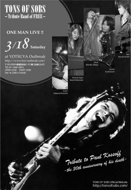 今年の3/19は、コゾフ没後ちょうど30年です。その前夜、亡きKossoffを偲び、FREEの世界にたっぷりと浸れるライヴを二部構成でお送りします。TOSにとっても久々のワンマンライヴなので、各アルバムから満遍なく選曲したセットリストに加え、普段はなかなかできない珍しい曲も演奏の予定です。