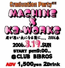[イベント名] Graduation Party"" 2006 MACHINE X K3-WORKS 君が思い出になる前に...。 2006春 [日時] 3.19.sun Open pm.9:00- [場所] CLUB BIBROS(村さ来・本店 向かいのビル7F) [料金] 前売 \1,500(2ドリンク付)・・・*1 当日 \2,000(2ドリンク付) [内容] DJ&DANCE *1 添付の画像を携帯等でCLUB BIBROSのフロントでお見せいただければ[前売料金]で入れます。また、不都合のある方は、卒業パーティーの事をお話されても結構です。 *2 先着30名に1ドリンクサービス *3 参加DJのCDプレゼント(限定?枚) 2004-2006にか