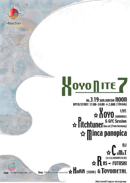 いよいよあさってです!METAL NIIGHTでお馴染みTOYOMETALも参加!!!します!!! ☆Food & Shopも充実!皆様是非遊びに来て下さい! ■ 3月19日 (日)『XOYO NITE7』@梅田 NOON OPEN・START17:00〜24:00 ¥2000+1DR 『LIVE』 XOYO & XOYO GFC Session Pitchtuner【Duo Set】From Germany・ミンカパノピカ 『DJ』 CxMxT【濡れ牧場.GRASSROOTS】RasFutoshi【ex.KAWACHI ROCKERS.】 Hara【SSSR】・TOYOMETARL【METAL NIGHT】 ☆Food & Shop 竹&ポVermilion Shop (雑貨、CD)・Golden fudge cake(デリ) Balanko(ファラフェル&ベルリン