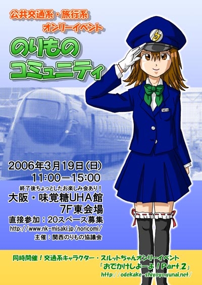 mixiのイベントとはちと意味合いが外れて しまいますが…同人誌即売会の告知です。 大阪では初めて?のりもの系の同人誌即売会 「のりものコミュニティ」が開催されます。 詳しくは公式サイトへ・・・とか言いますが 私が制作担当をしてたりします(笑) http://www.nk-misaki.jp/noricomi/ サークル参加募集は2月13日まで オンライン申込も可能です(…可能になりました) この機会ついでにこのコミュニティメンバーとの 繋がりにしてもらえたらなぁとか思ったりします。 関係者でありながら自ら宣伝してちょっぴり 情けないで