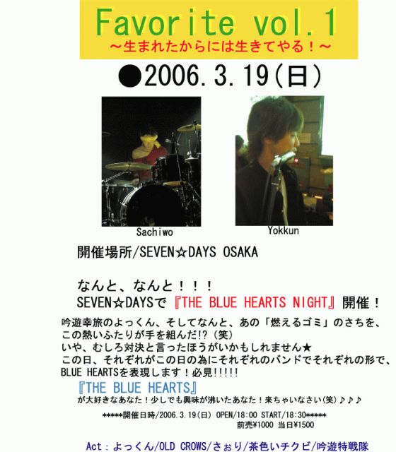 イベントのお知らせ☆ **2006.3.19(日)** 『Favorite vol.1』 〜生まれたからには生きてやる〜 場所/SEVEN☆DAYS OPEN/18:00 START/18:30 出演/吟遊特戦隊、茶色いチクビ、 さぉり、OLD CROWS、よっくん チケット 前売/\1000 当日/\1500 SEVEN☆DAYSホームページ http://www.osaka7days.com/