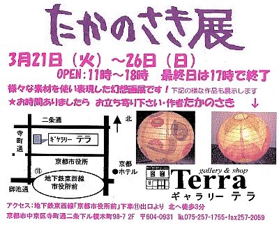 はじめまして 個展の告知をさせてください この度 京都の寺町二条近くのレトロな画廊で 和を取り入れた幻想画の展覧会を開催したします ◆和な幻想的・幽玄的な世界を春の霞の京都で開催いたします 「あかり作品:約十数点」と「平面作品:約十数点」の二種類で表現しています *たかのさき 京都幻想画個展告知* 期間:2006年3月21日(火)〜26日(日) 開場時間:11時から18時(最終日は17時まで) 会場:ギャラリーテラ 場所:京都 寺町二条下がったところにある 1階は竹紙専門店です 京都市中京区寺町通