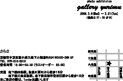 京都富小路三条 カフェ「さらさ」 で、「gallery yurimu」という展示会やります!! 展示会最終日(卒業式の前日) さらさでパーティーします☆彡 日時:3月21日(火)最終日の祝日 18:00〜21:00 人数:70〜100人 会費:3000円 形式:立食、ドリンク2杯+食事 プログラム予定: 18:00〜 受付開始 お客さんに、受付で、ドリンク券2枚とカタログをお渡しします。 来られた人から、飲み食いしながら、おしゃべりしてもらいます。 19:00〜 だいたい人数のそろったところで、