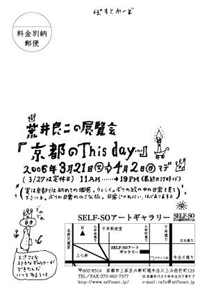 SELF-SOアートギャラリー 場所は北野天満宮のご近所。 そこの古い町家を改装してギャラリーとしてオープンするオープニングエキシビションです。セルフソウアートギャラリーです。 現在のサイト http://www.selfsoart.jp/index.html となっています。またどうぞ。