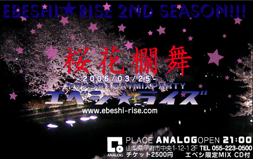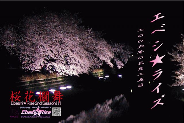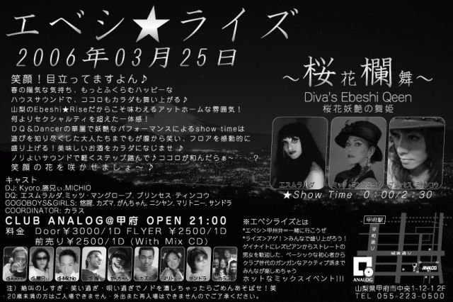 ハウスはハウスでも歌ものハウス♪ 今回は95年〜最近までの洋物、和物ハウスてんこ盛りww 集え歌好き!!笑 笑顔!目立ってますよん♪ 春の陽気な気持ち、もっとふくらむハッピーなハウスサウンドで、ココロもカラダも舞い上がる♪ 山梨のebeshi★riseだからこそ味わえるアットホームな雰囲気! 何よりセクシャルティを超えた一体感! DQ&Dancerの華麗で妖艶なパフォーマンスによるshow timeは遊びを知り尽くした大人たちまでもが腹から笑い、フロアを感動的に盛り上げる! 美味しいお酒をカラダになじませ ♪ ノリよいサ