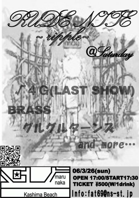 またまたライブやります!! ぜひ皆さん遊びに来てください☆ 3/26日(sun) 【RUDENITE〜ripple〜】 @Saturday OPEN17:00/START17:30 TICKET \500(W/1drink) BAND ■√4G(last show) ■BRASS ■グルグルターンズ and more…! http://ip.tosp.co.jp/i.asp?i=rudenite