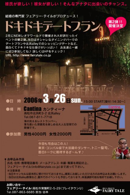 2月にNewレオマワールドにて行われたドキドキデートプランが大好評につき、第2弾が決定!! 彼氏、彼女の居ないあなたに恋愛と結婚の専門家 ブライダルプロデュースフェアリー・テイルがプロデュースするイベントです。 日 時:3月26日(日曜日) 15:00〜(14:30より受付開始) 場 所:北浜Alleyカンティーナ 参加費:男性4,000円 女性2,000円(ドリンク付) 《お申し込み方法》 氏名・住所・携帯電話番号・メールアドレス・年齢・職業を明記の上フェアリー・テイル(info@fairytale.co.jp)までメール