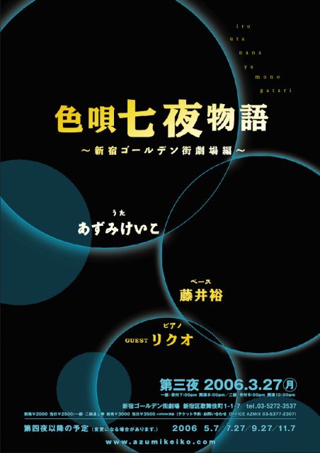 あずみけいこ色唄七夜物語 シリーズ第三夜はピアノとの協演。 何が生まれてくるか楽しみです。 3月27日 (月) 色唄七夜物語 第3夜 〜新宿ゴールデン街劇場編〜 At : 新宿ゴールデン街劇場 出演 :あずみけいこ 藤井裕:Bass Guest リクオ:Piano 新宿区歌舞伎町1-1-7 Tel:03-5272-3537 一部:受付 7:00pm 開演 8:00pm 二部:受付 9:00pm 開演 10:00pm 前売 \2,000 当日\2,500 一部・二部通し券 前売 \3,000 当日\3,500 ※Drink別 チケット予約・お問い合わせ OFFICE AZMIX:03-5377-