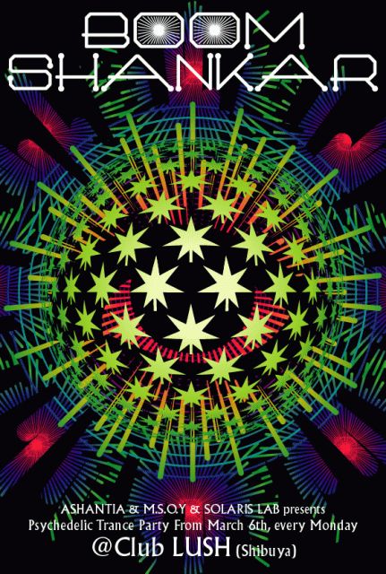 SHANTIA & M.S.O.Y & SOLARIS LAB presents BOOM SHANKAR http://www.msoy.org M.S.O.Y、Solaris、ASHANTIAがタッグを組んで お贈りするBOOM SHANKER! みなさん、遊びに来てください。 ライブハウスなので音質は保証◎。 MONDAY NIGHTを楽しみしょう! Venue:Club LUSH (Shibuya) http://www.toos.co.jp/lush/ Start 23:59 / 2500Yen + 1 Drink / 2000Yen + 1 Drink with flyer 3月13日 DJs EL-5 (DrapDrop/ALCHEMY RECORDS) @raki(Jz Trance) CAP (SUN−UP) HIRO (M.S.O.Y) TOMOKO (Quintrix) COWZY (albert