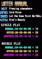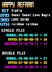 IIDX12 HAPPY SKYでのオリジナルコース作成機能を活用した mixi IIDXコミュイベント、 IIDX mixi INTERNET RANKING 2は、 おかげさまで好評のうちに、 #1(10/7〜)、#2(11/11〜)、#3(1/3〜)、全て終了出来ました。 ご参加ご協力いただいた皆様、誠にありがとうございました。 (_O_) 開催済の#1、#2、#3の対象コース紹介です。 ★ 0:MY NAME IS... コース(βテスト用) ♪ ★ (CHARLOTTE→MARIA→Daisuke→Lucy) [IIDX mixi IR2 #1(10/7〜)] ★ 1:POP STEP DANCE! コース ♪ ★ (HIGHER→Mr.T→Fly Away To India→SP