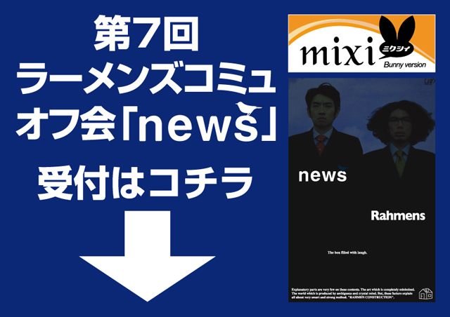 どもども。ダメダメ幹事のけーりん3号でございます。 小林賢太郎LIVE POTSUNEN 2006「○maru」東京公演真っ最中でお忙しいことと思いますが、 第7回ラーメンズ・コミュオフ会「news」@東京 の開催を告知させていただきます! 今回は自称・コント番長の小林賢太郎氏、33歳のお誕生日イブイブにあたる週末に以下の通り開催します。 ◆日時/2006年4月15日(土) ◆開催地/新宿 ※参加人員によって、前回と同場所での開催となる場合がございます。予めご了承ください。 ◆時間/18:00〜22:00の間のいずれか(未確定) 今回は「二次