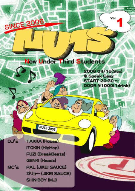 NUTS〜New Under Third Students〜 2006 04/15(Sat) @ Speak Easy START 20:30〜 DOOR ¥1000(1 drink) DJ's TAKKA(House) ITOKIN(Hiphop) FUZI(Breakbeats) GENKI(Headz) MC's JIKEI SAUCE SHIN-BOY(MJ) What's "NUTS"? 好きな音楽、ジャンルもバラバラなメンバーで イベントを行うとどうなるのか!? HOUSE、HIP HOP、BREAK BEATS、HEADZ 音が集まる場所はココ Speak Easy こんなにもバラバラなジャンルのメンバーが集まっても 共通点はただひとつ。「音が好き」これに限る! いろんな音が飛び交うイベン
